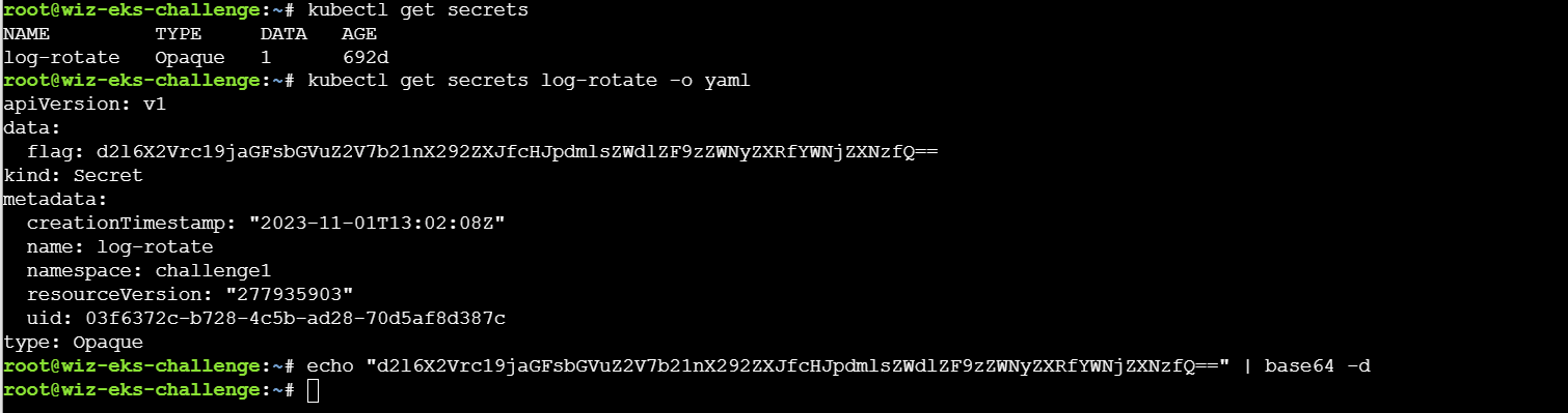 列出当前 命名空间(namespace) 下的所有 Secret,并使用命令kubectl get secret log-rotate -o jsonpath='{.data.flag}' | base64 --decode