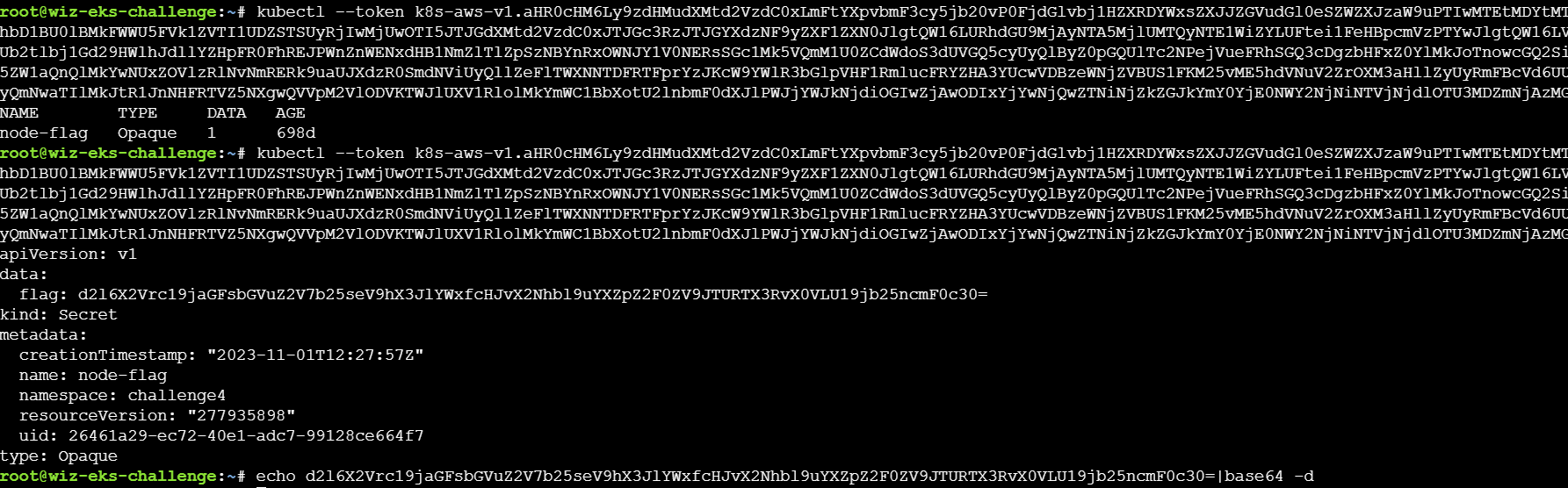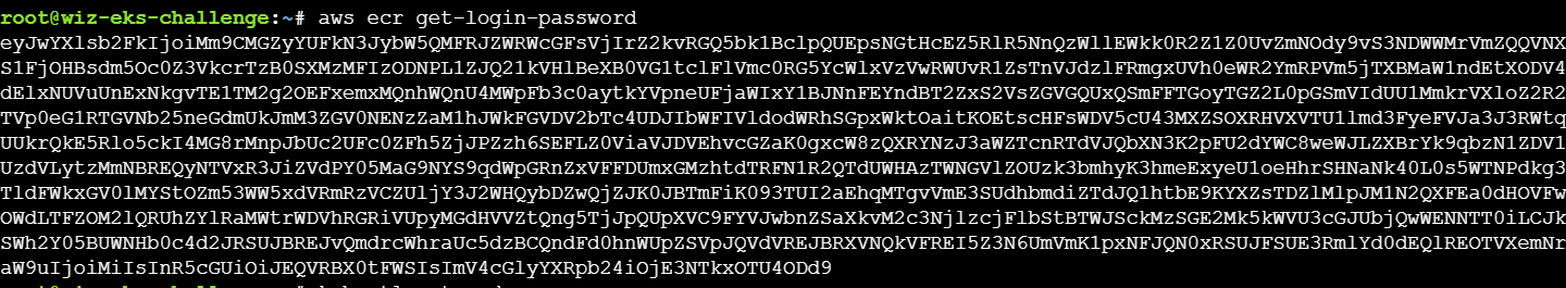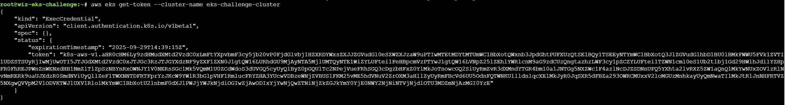 获取到的是eks-challenge-cluster-nodegroup-NodeInstanceRole这个角色的凭据,而AWS的role命名有一个规则:<cluster-name>-nodegroup-NodeInstanceRole,因此可以知道cluster-name为eks-challenge-cluster,可以通过get-token来获取集群的凭据: