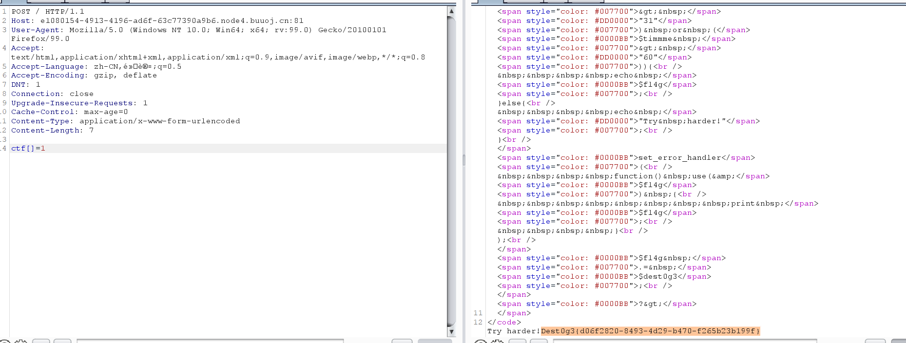 字符串拼接出错即可引发错误输出flag,直接发一个数组即可.
