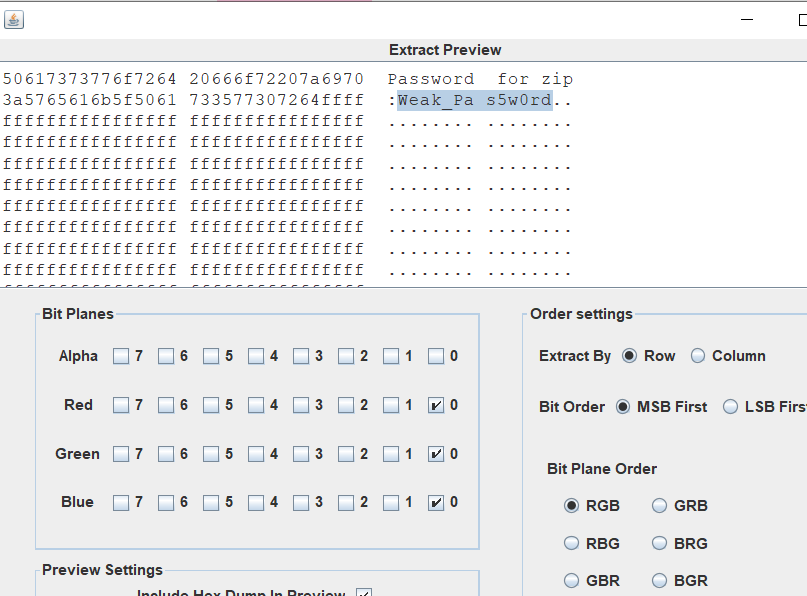 用Stegsolve查看png图片可以发现RGB三个通道最低为存在lsb隐写,提取得到压缩包密码Weak_Pas5w0rd