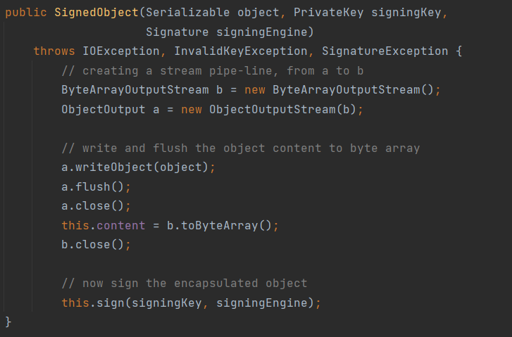 } public static SignedObject makeSObj(Serializable o) throws IOException, InvalidKeyException, SignatureException{ return new SignedObject((Serializable) o, new DSAPrivateKey() { @Override public DSAParams getParams() { return null; }