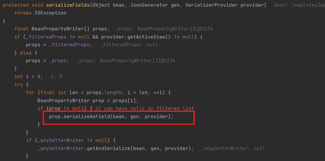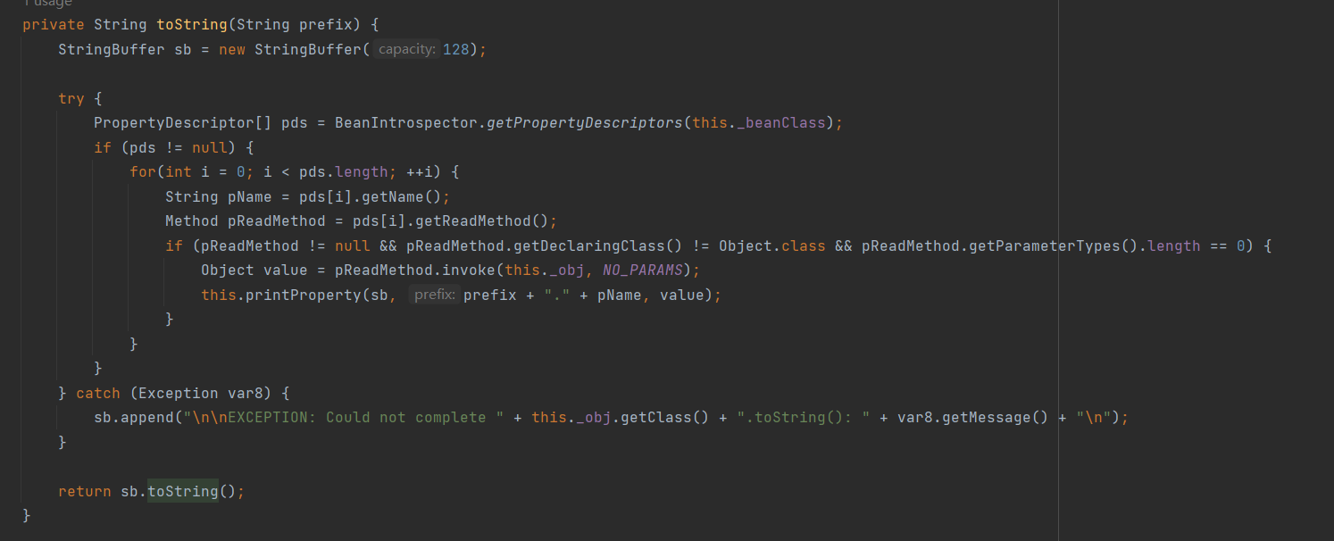 之后会在下面循环调用获取到的getter方法进行反射调用,所以如果ToStringBean