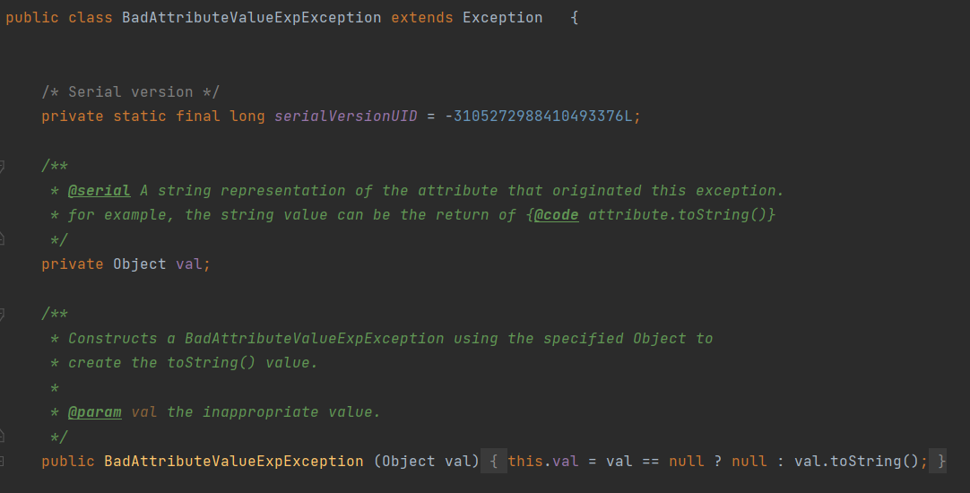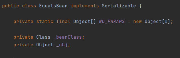 ToStringBean toStringBean = new ToStringBean(Templates.class,new ConstantTransformer(1)); EqualsBean equalsBean = new EqualsBean(ToStringBean.class,toStringBean);